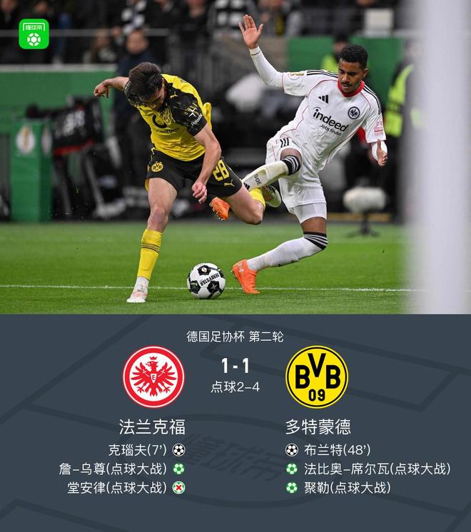 北京時(shí)間10月29日德國足協(xié)杯 第二輪,法蘭克福對陣多特蒙德。上半場格策助攻克瑙夫單刀破門。下半場瑞爾森助攻布蘭特破門扳平比分。加時(shí)賽雙方均無建樹,點(diǎn)球大戰(zhàn)堂安律、沙伊