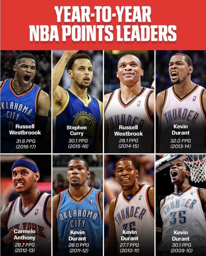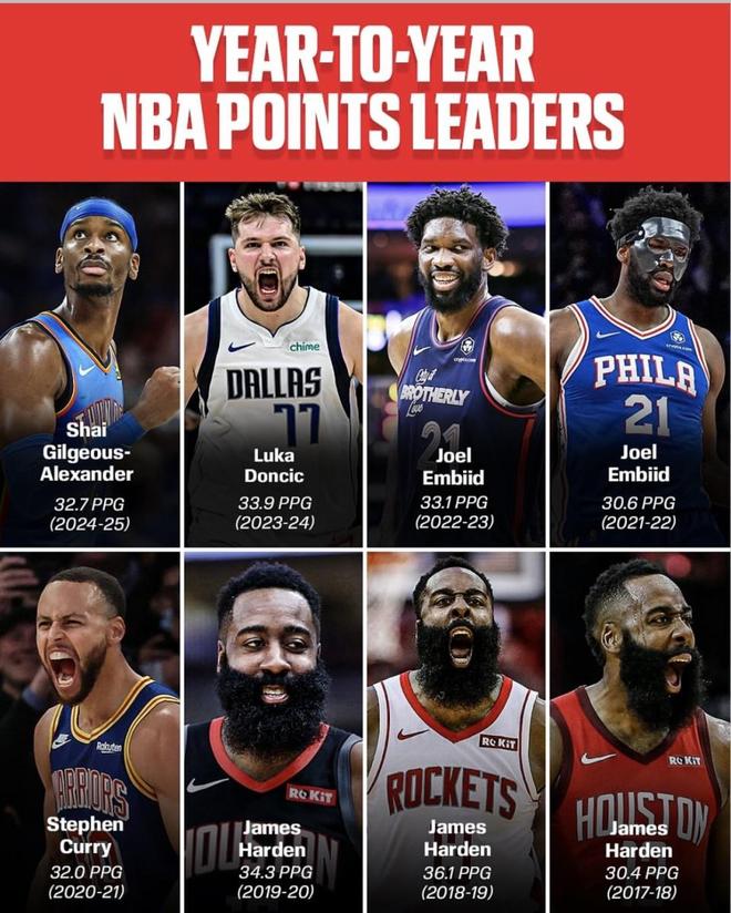NBA新賽季已經開始,每逢新賽季開始,關于“誰才是聯盟最會得分的人?”的話題都會被重新提起。回望近16季的常規賽場均得分王,從杜蘭特的青春登基,到哈登的高產時代,再到恩比德與東契奇的內外線統治,近年謝伊的崛起又把話題推高。下面這份年表按賽季逐一列出常規賽場均得分王,可作為我們判斷新季風向與“得分話語權”流轉的參照。