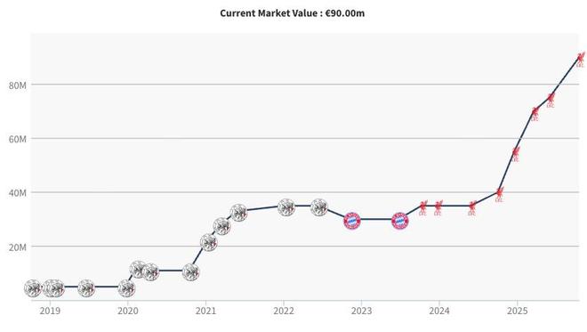 赫拉芬貝赫自2024年10月以來身價不斷攀升,從3500萬歐一路上漲,在這次更新中,這位利物浦中場的身價上漲了1500萬歐,從7500萬歐漲至9000萬歐。