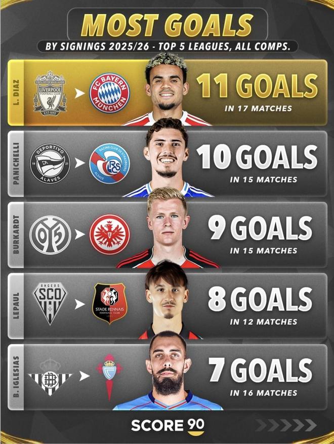 最近SCORE90發布了五大聯賽25/26賽季新援榜單。迪亞斯、拉什福德等表現突出,尤其拉什福德離開曼聯后狀態明顯提升,進球與助攻更穩定。圍繞“誰是這份榜單里表現最好的新援”,你的第一選擇是誰?